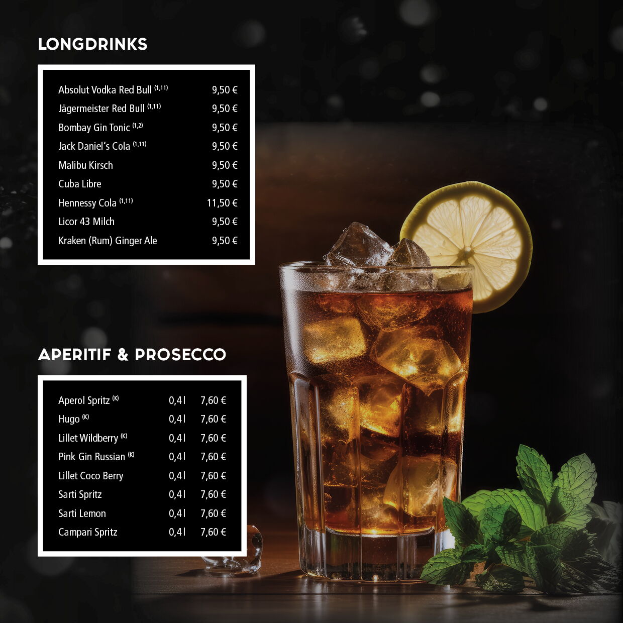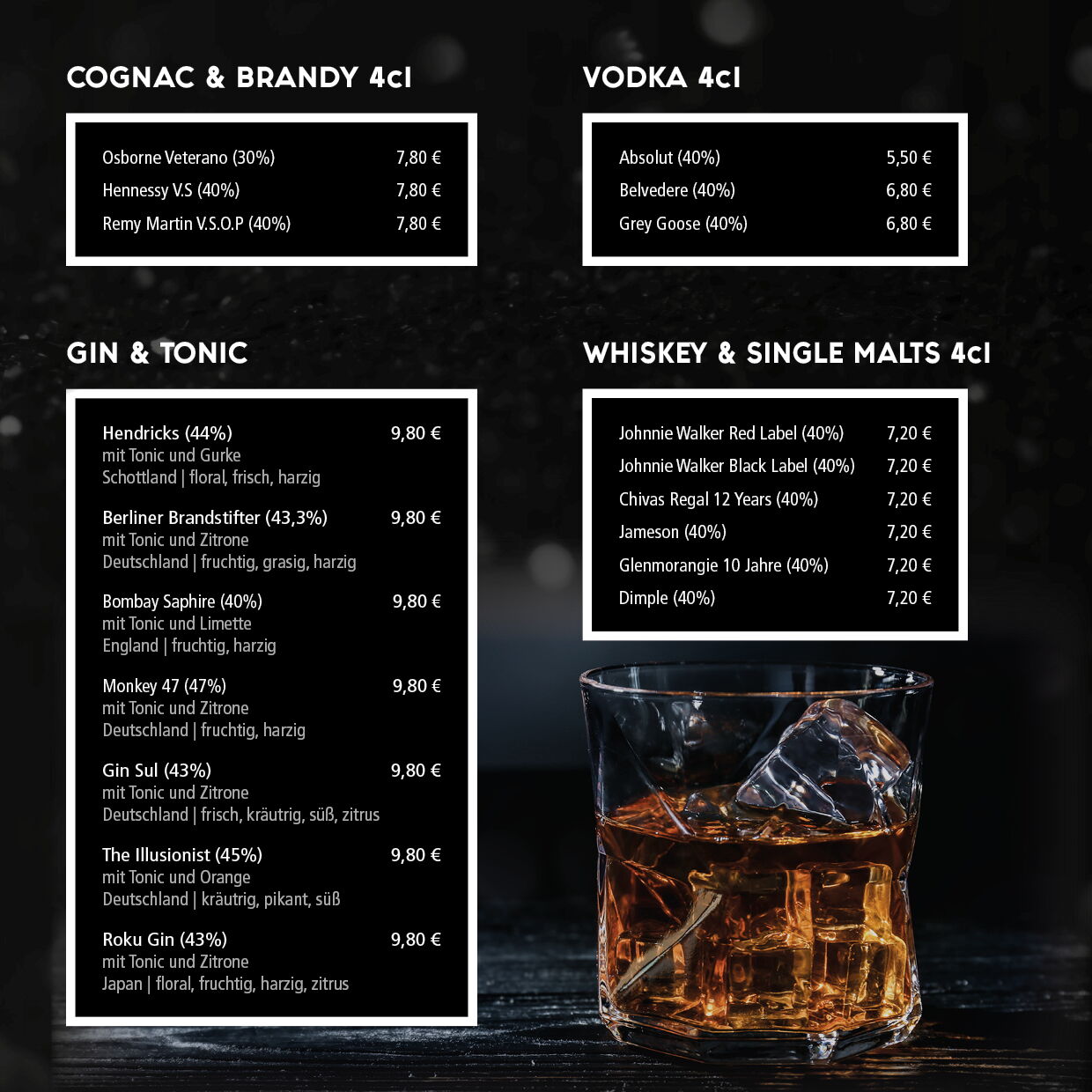 Premium-Spirituosen- und Liköre, hausgemachte Säfte und frische Zutaten sind die Grundbausteine, um euch und euren Gästen sensationelle Drinks zu servieren. So wird das Society zu einem Ort der Entspannung, des Wohlfühlens oder einfach zum Treffen und Genießen.