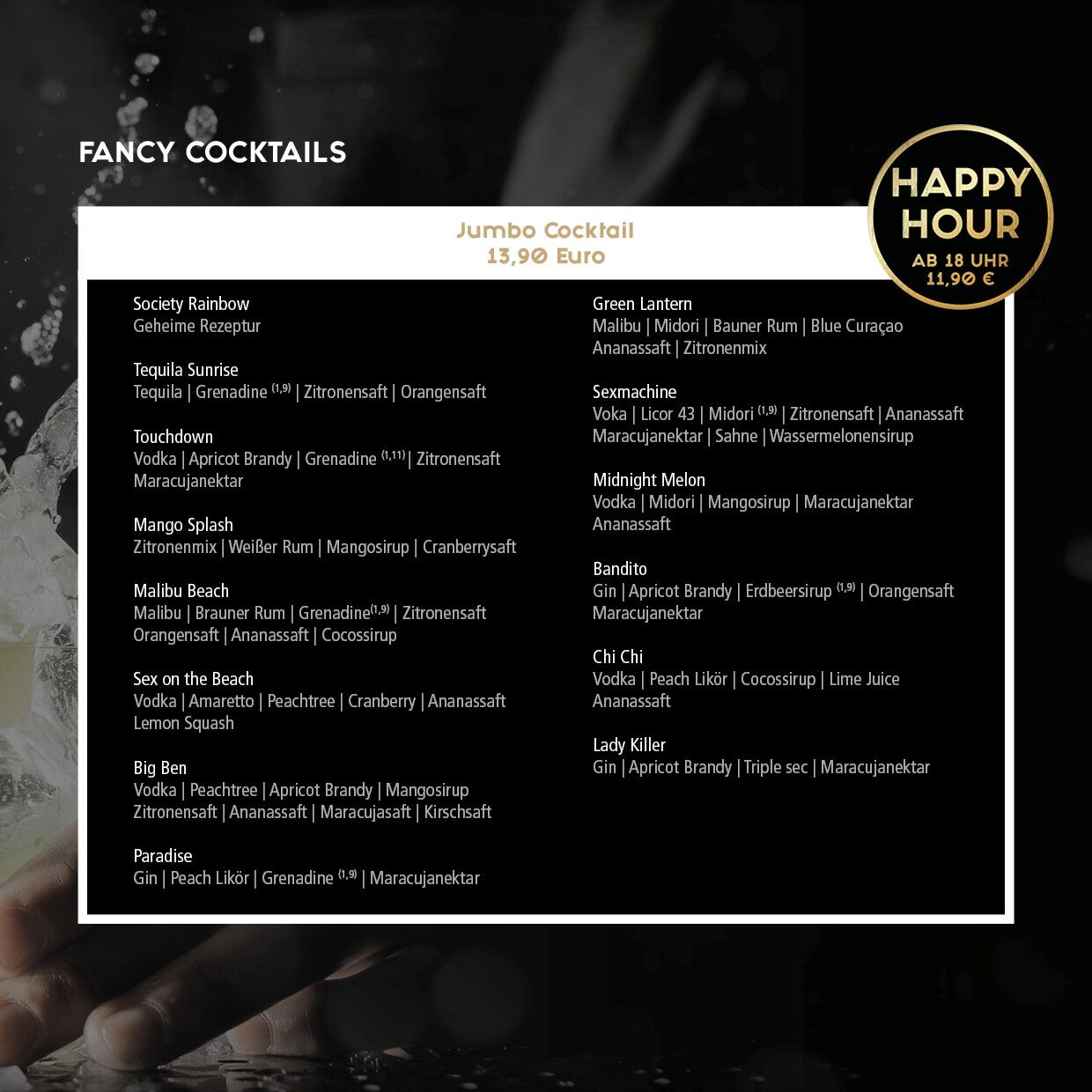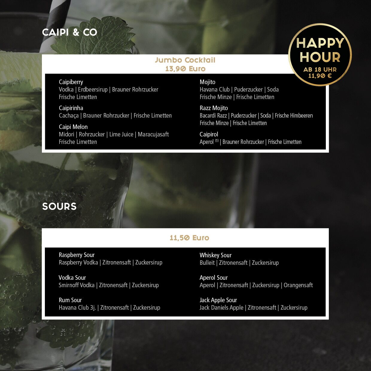 Happy Hour von 14:00 bis 20:00 Uhr auf alle normalen Cocktails sowie ab 20:00 Uhr auf alle Jumbo Cocktails