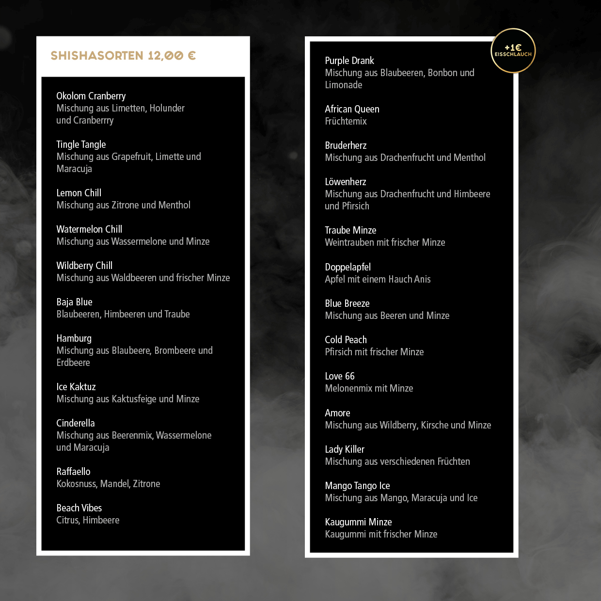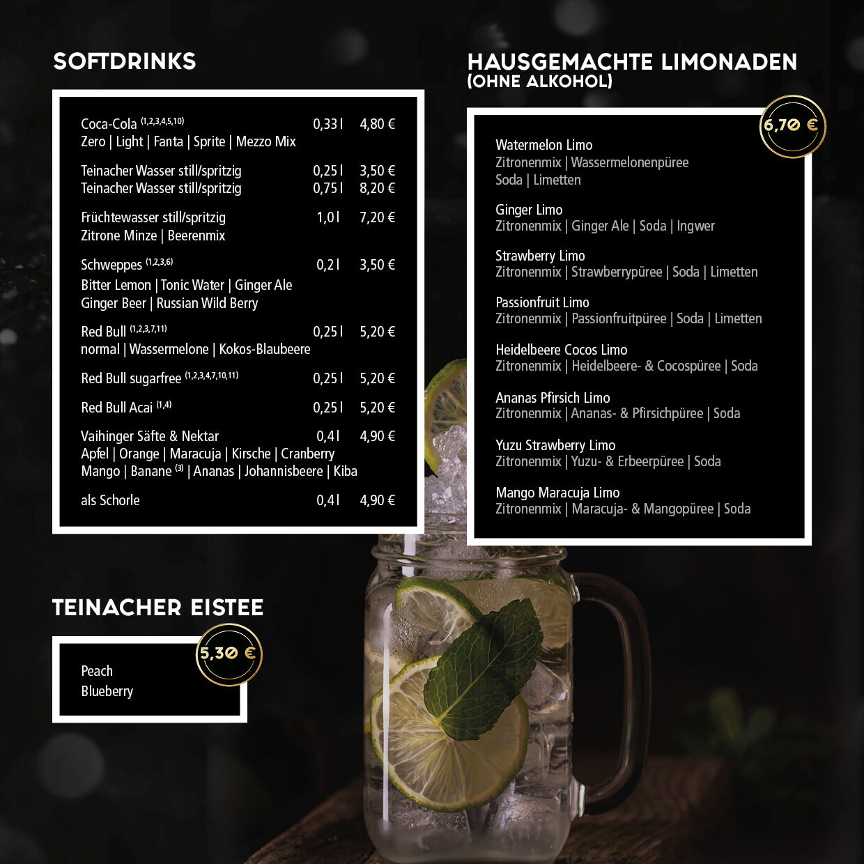 Premium-Spirituosen- und Liköre, hausgemachte Säfte und frische Zutaten sind die Grundbausteine, um euch und euren Gästen sensationelle Drinks zu servieren. So wird das Society zu einem Ort der Entspannung, des Wohlfühlens oder einfach zum Treffen und Genießen.